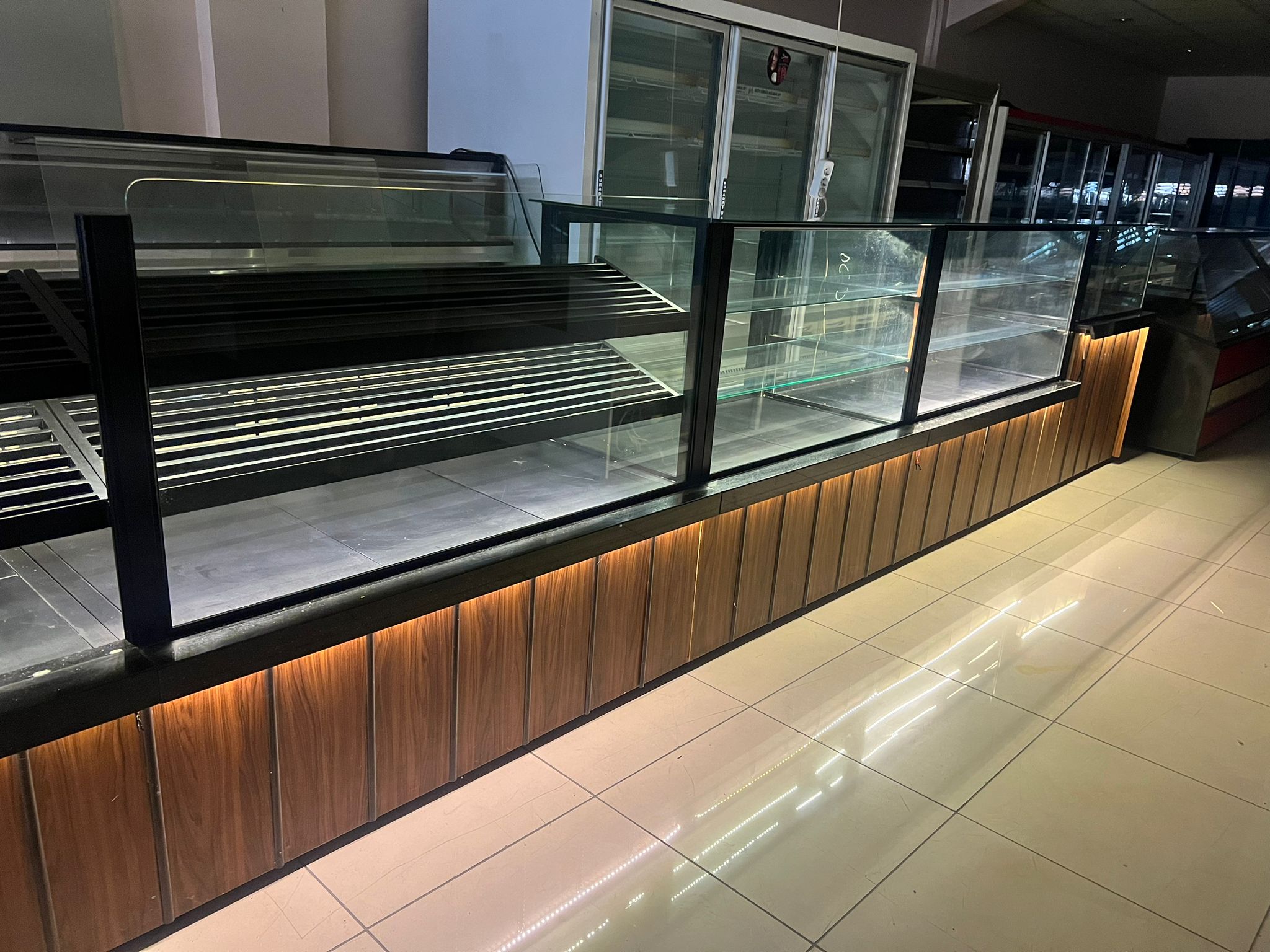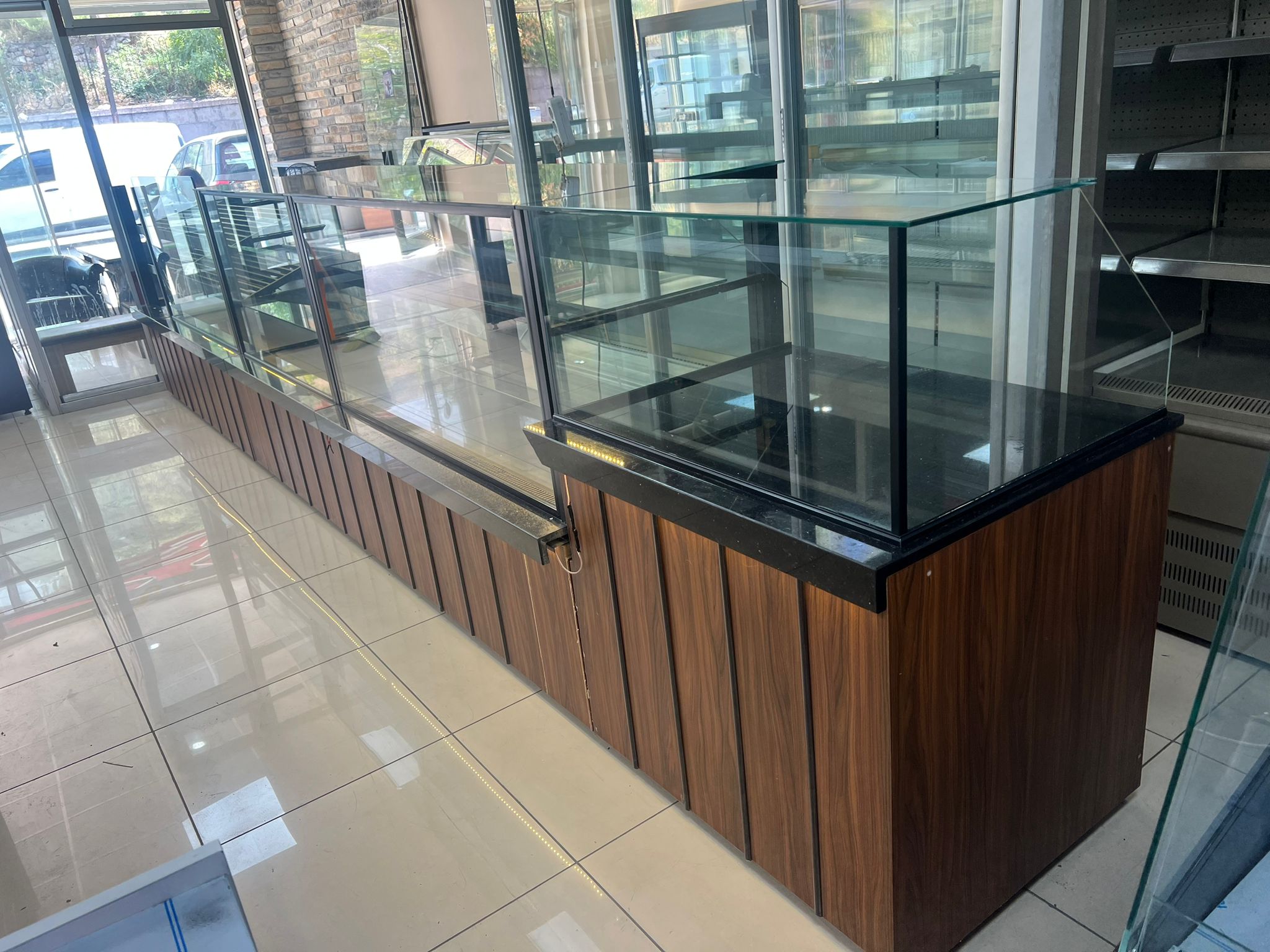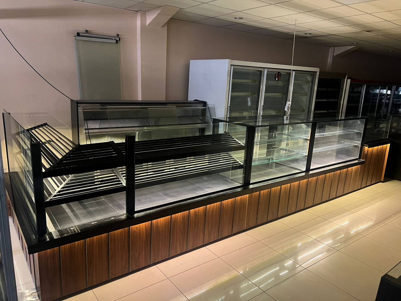 Modern Estetik: Siyah granit tezgah yüzeyi, ahşap görünümlü alt paneller ve antrasit profil detayları ile modern ve sıcak bir mağaza atmosferi yaratır.