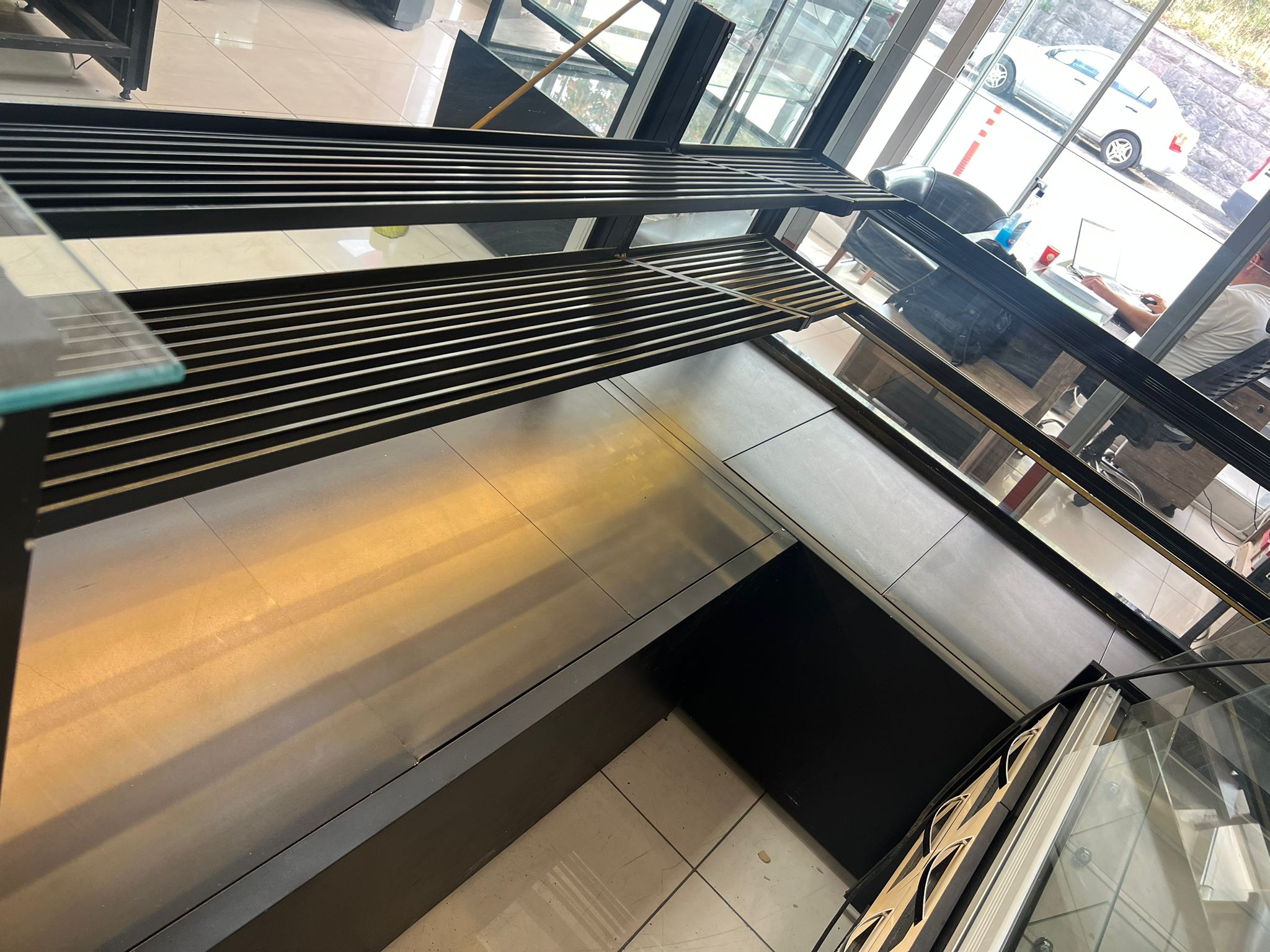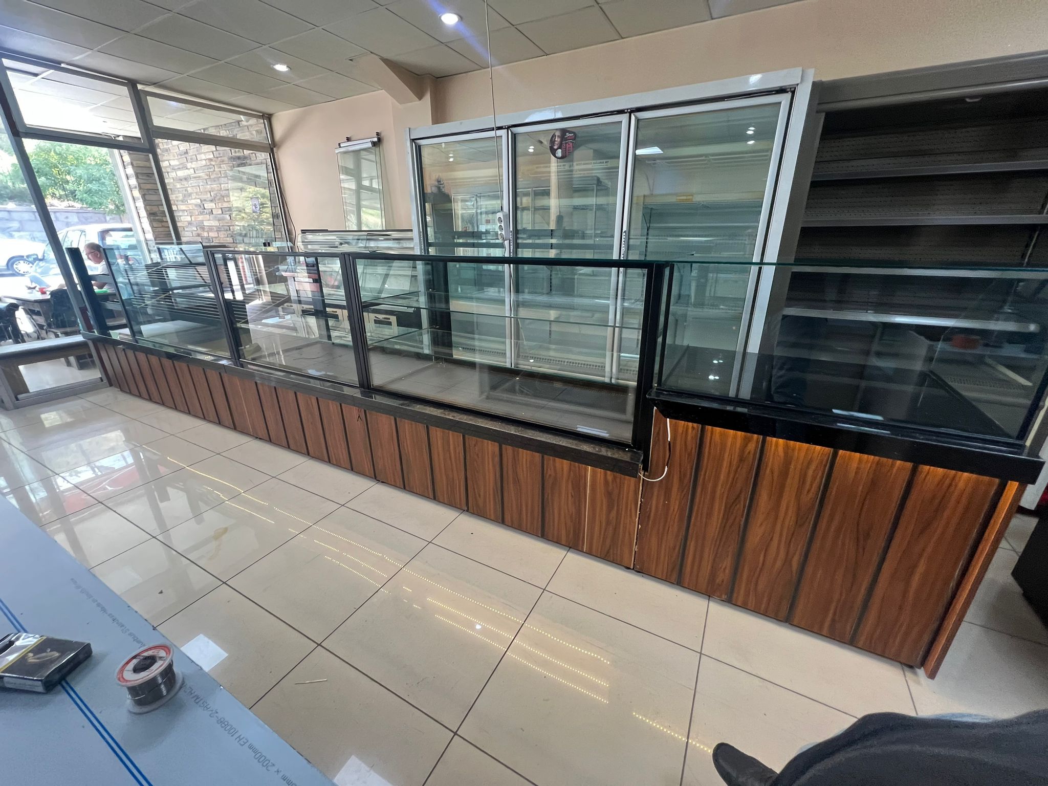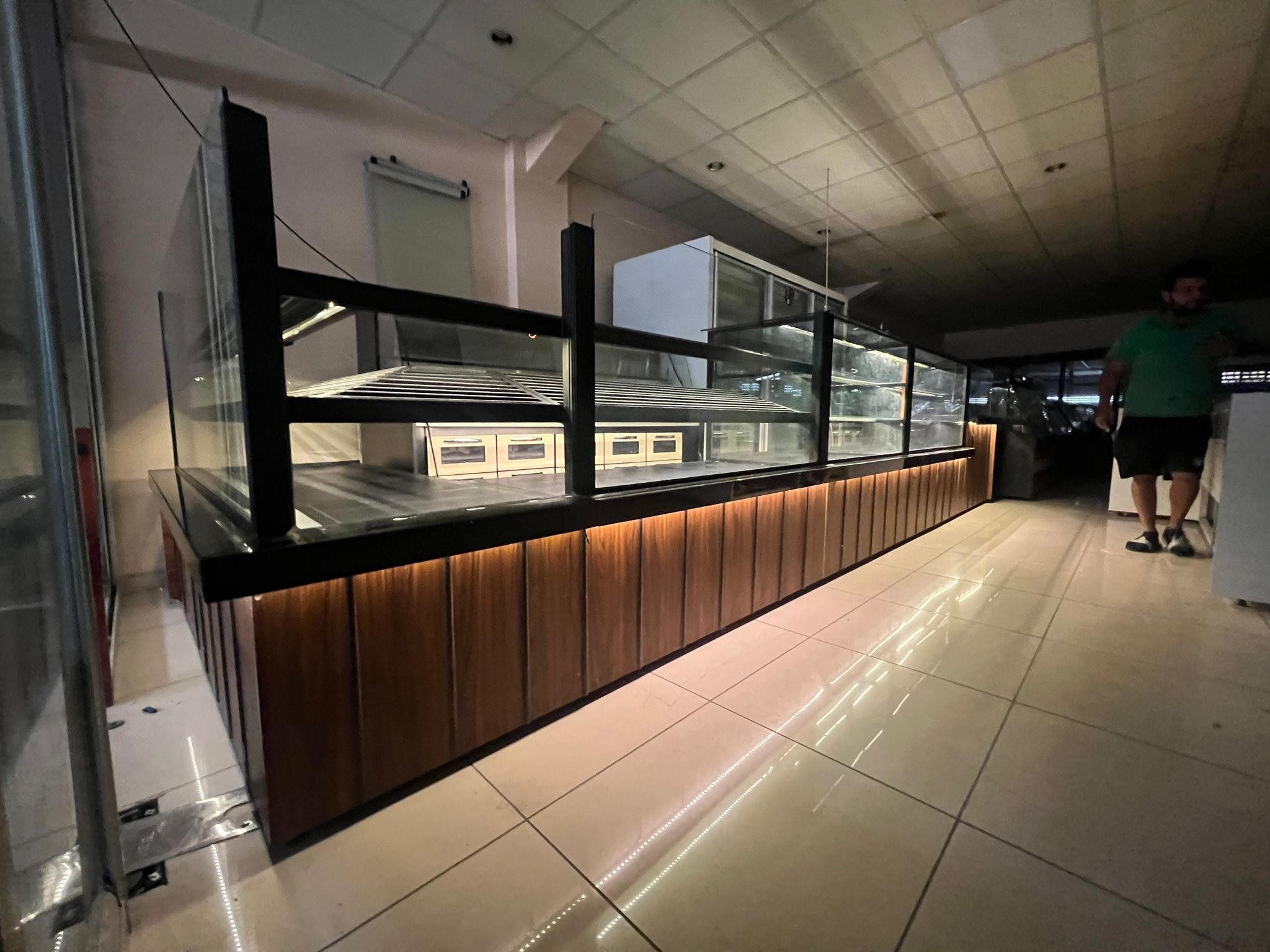 Modern Estetik: Siyah granit tezgah yüzeyi, ahşap görünümlü alt paneller ve antrasit profil detayları ile modern ve sıcak bir mağaza atmosferi yaratır.